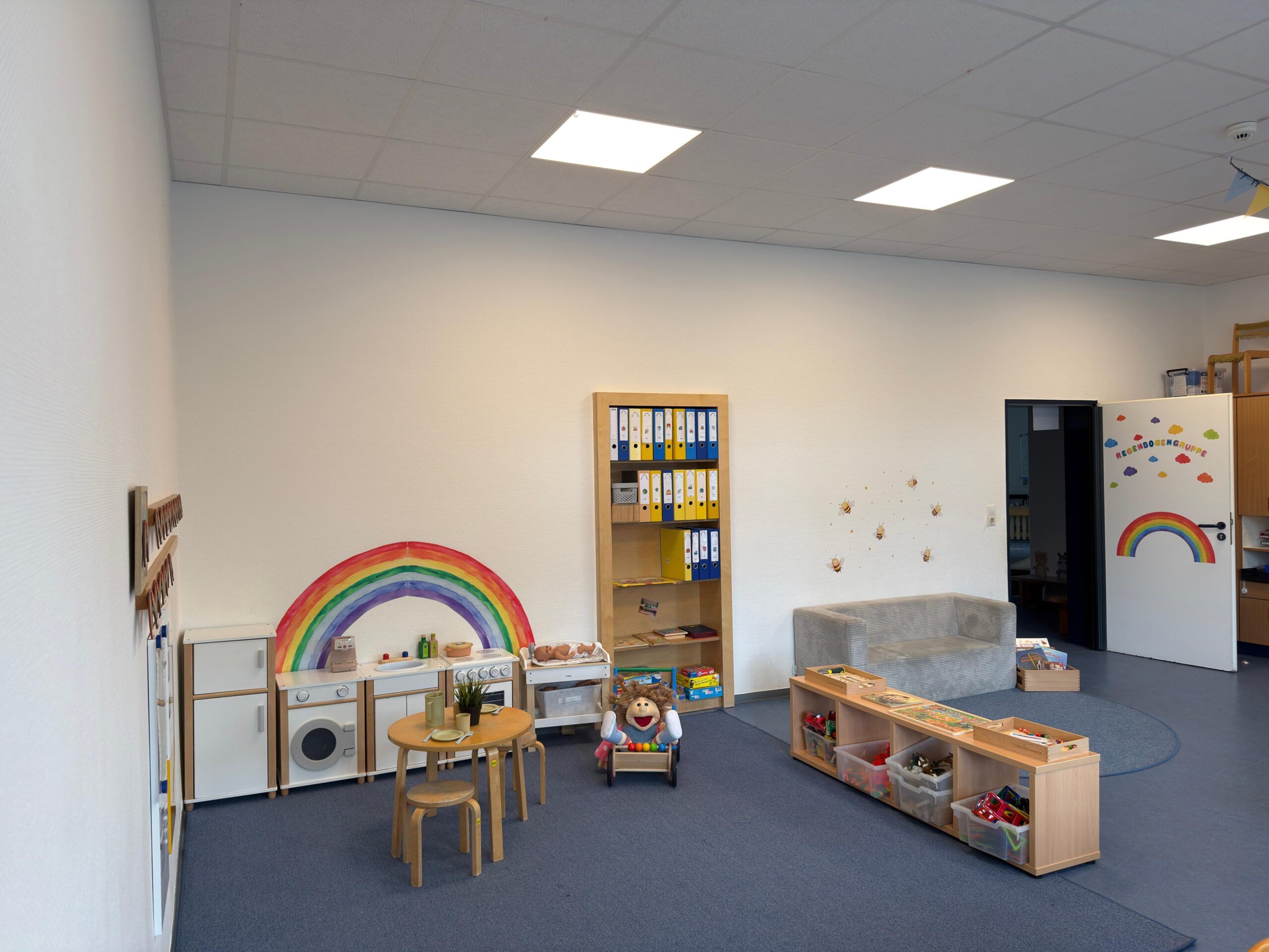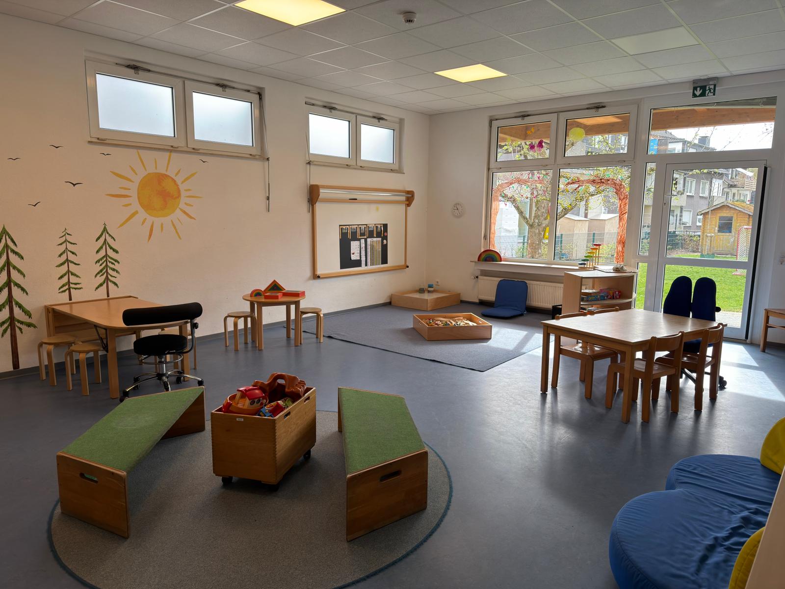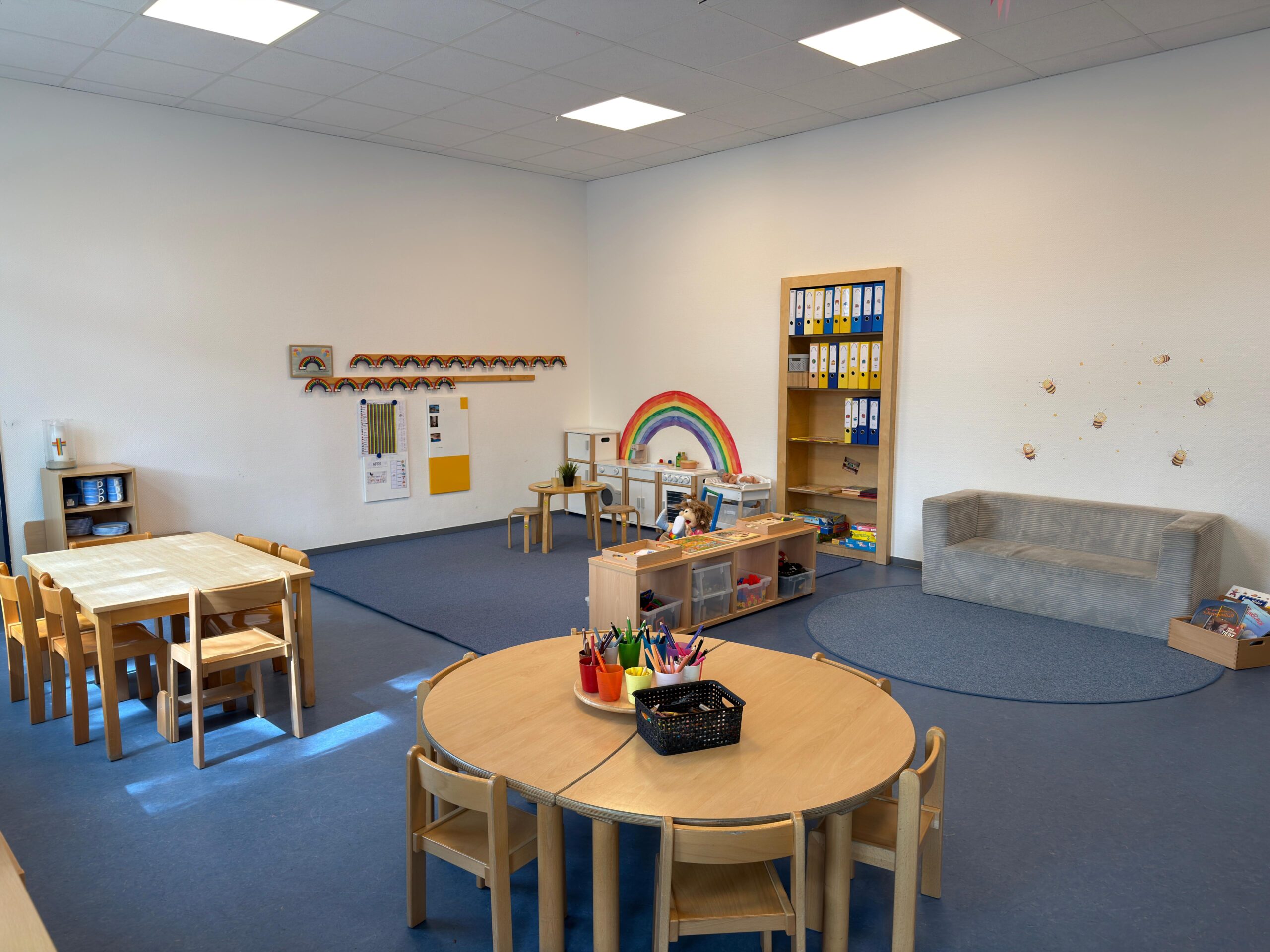 Unsere Einrichtung ist mit den zwei pädagogischen Gruppen schön klein und übersichtlich. Die Sonnengruppe befindet sich in einem hellen, großzügigen Raum. Die Regenbogengruppe verfügt über einen geräumigen Gruppenraum sowie einen Nebenraum, der je nach Interesse der Kinder gestaltet wird – mal als Bauraum, mal als Rollenspielraum oder auch Adventsstübchen.